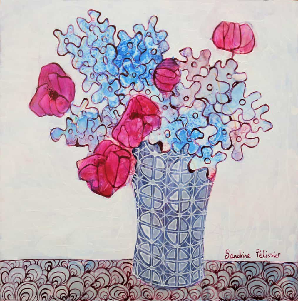 My wife loves color and flowers, and loved Sandrine’s art that we saw in a gallery on a trip to BC. I took a picture of it and surprised her with it for Christmas. She absolutely loved it. Wanted it hung above the stove so she could see it often, since she also loves cooking.