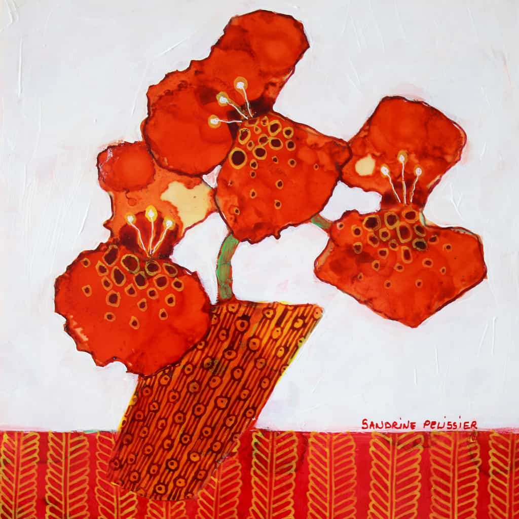 My wife loves color and flowers, and loved Sandrine’s art that we saw in a gallery on a trip to BC. I took a picture of it and surprised her with it for Christmas. She absolutely loved it. Wanted it hung above the stove so she could see it often, since she also loves cooking.