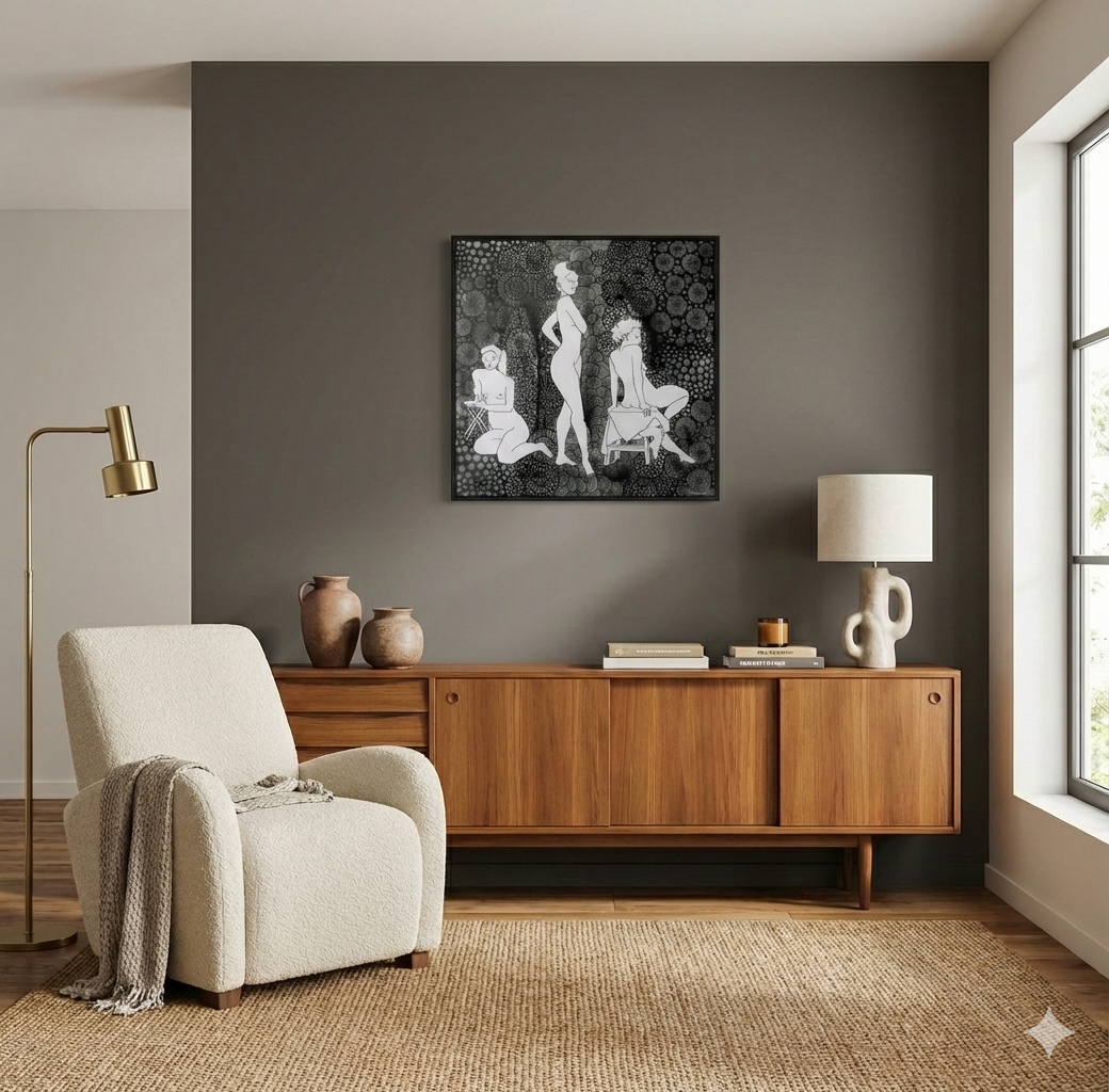 Sandrine has the uncanny ability to draw and capture the essence of the human figure. I know, because I’ve been part of the same figure drawing group with her for almost 2 years. I also know it takes real skill, talent and acute observation to be able to draw like that—and she makes it all look so effortless—believe me— it’s not. I wanted her art to be part of my very eclectic art collection.
