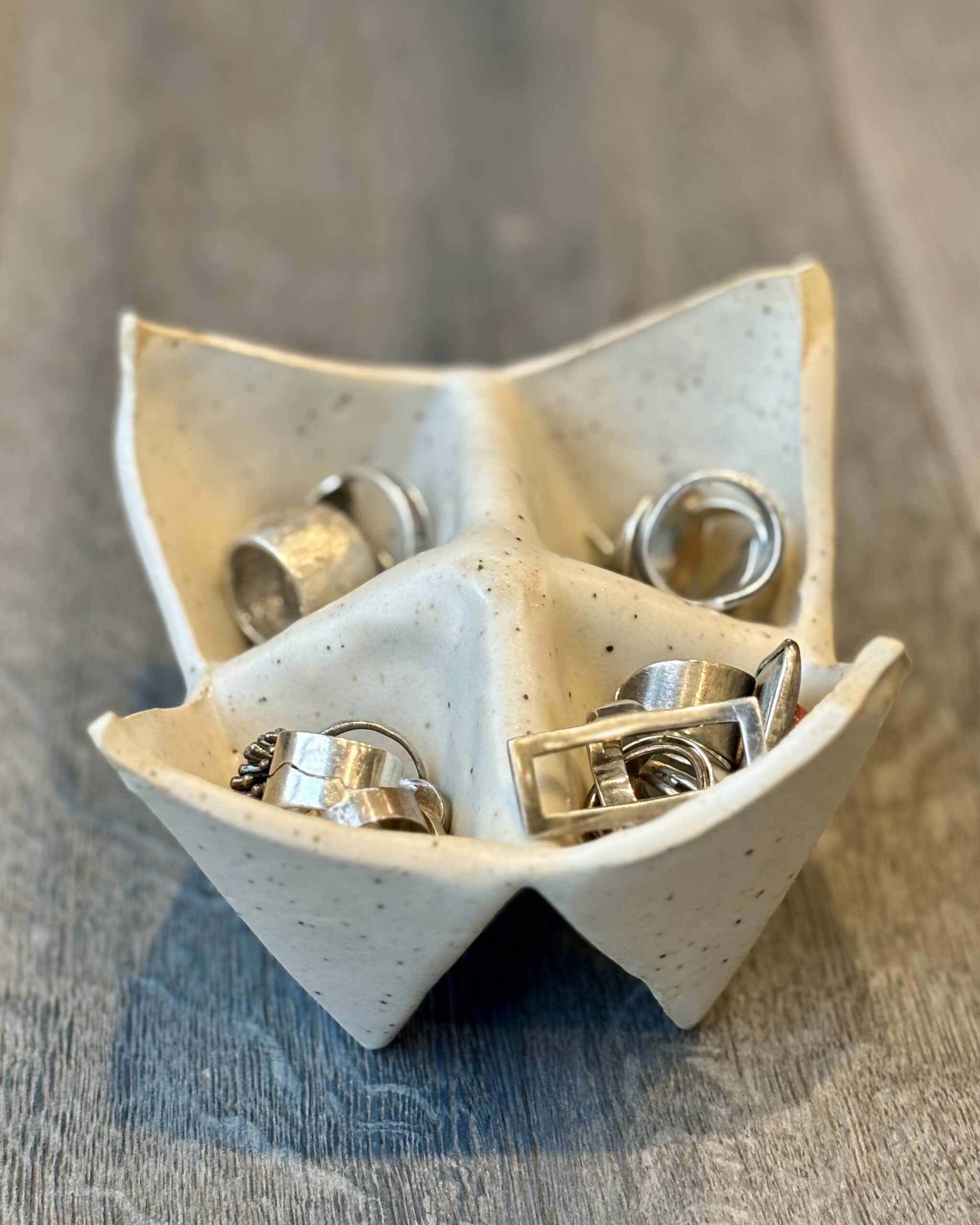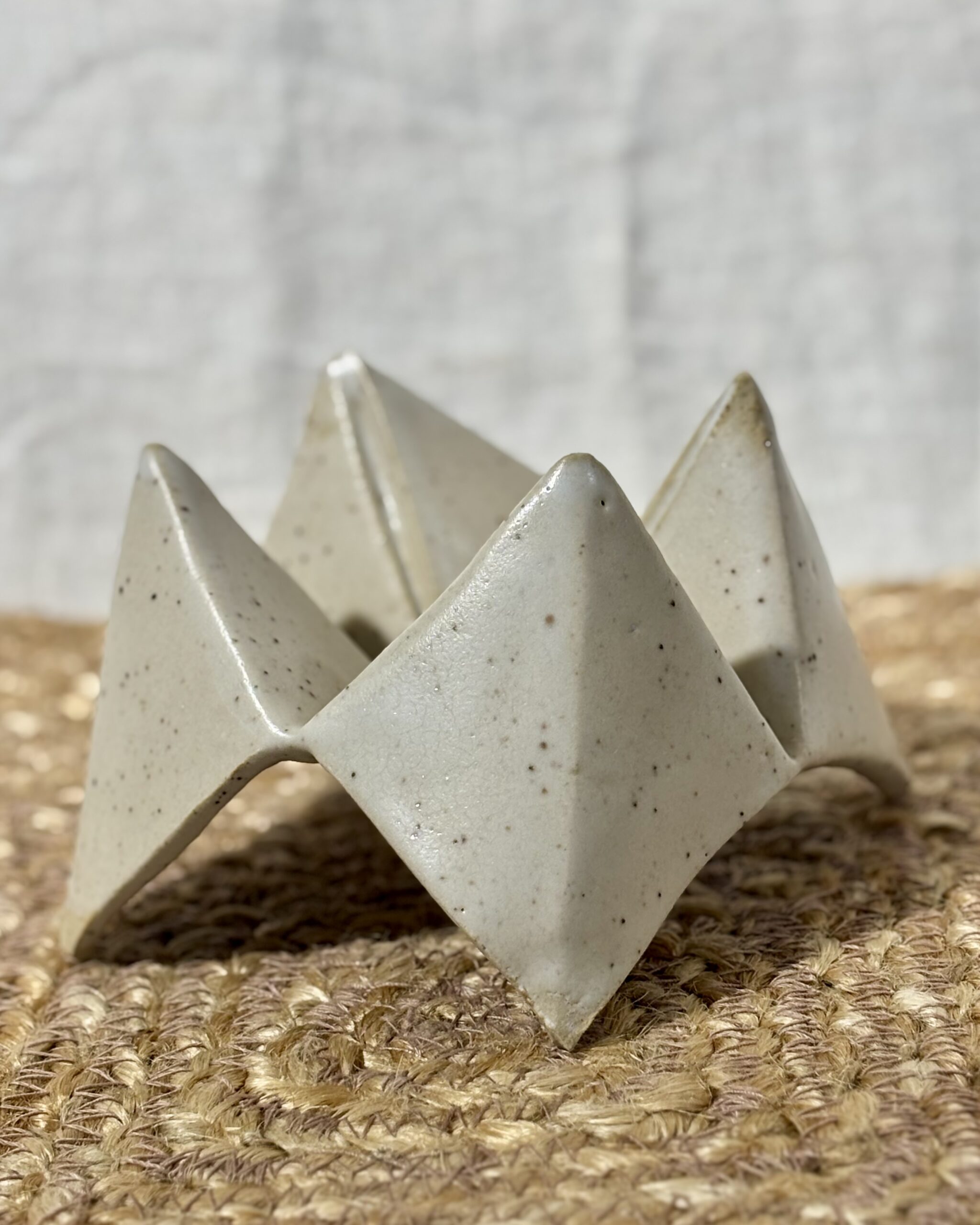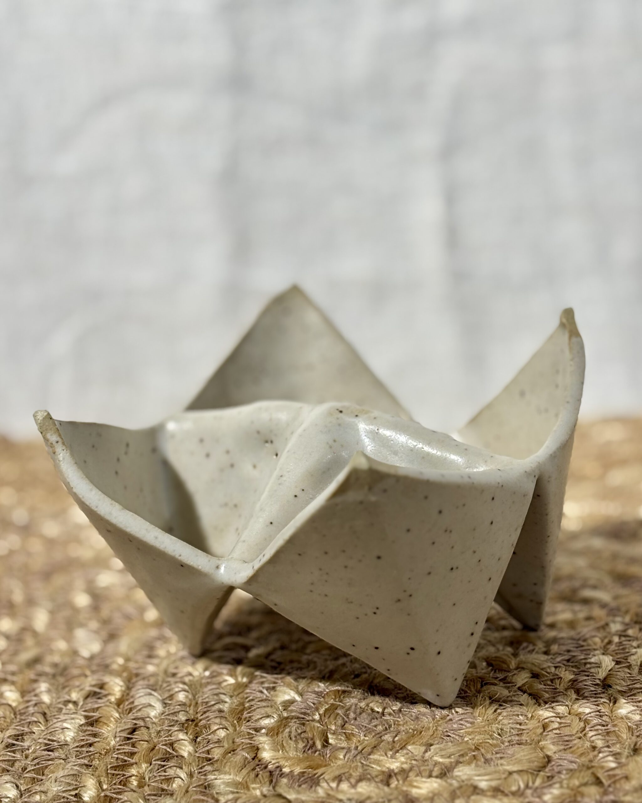 Remember making paper fortune tellers as a kid? We have brought that playful, nostalgic shape to life in beautiful, handmade ceramic! This large, sculptural dish mimics the iconic folded origami silhouette, making it a delightfully wonky and versatile piece for any room. Use the individual pockets in the kitchen as a unique spice cellar for sea salt and chili flakes, or as a dipping dish for sushi nights. Or, bring it to your vanity to beautifully cradle your favorite rings and earrings. Whether it is serving food or acting as a standalone geometric sculpture, it is guaranteed to be a conversation starter.