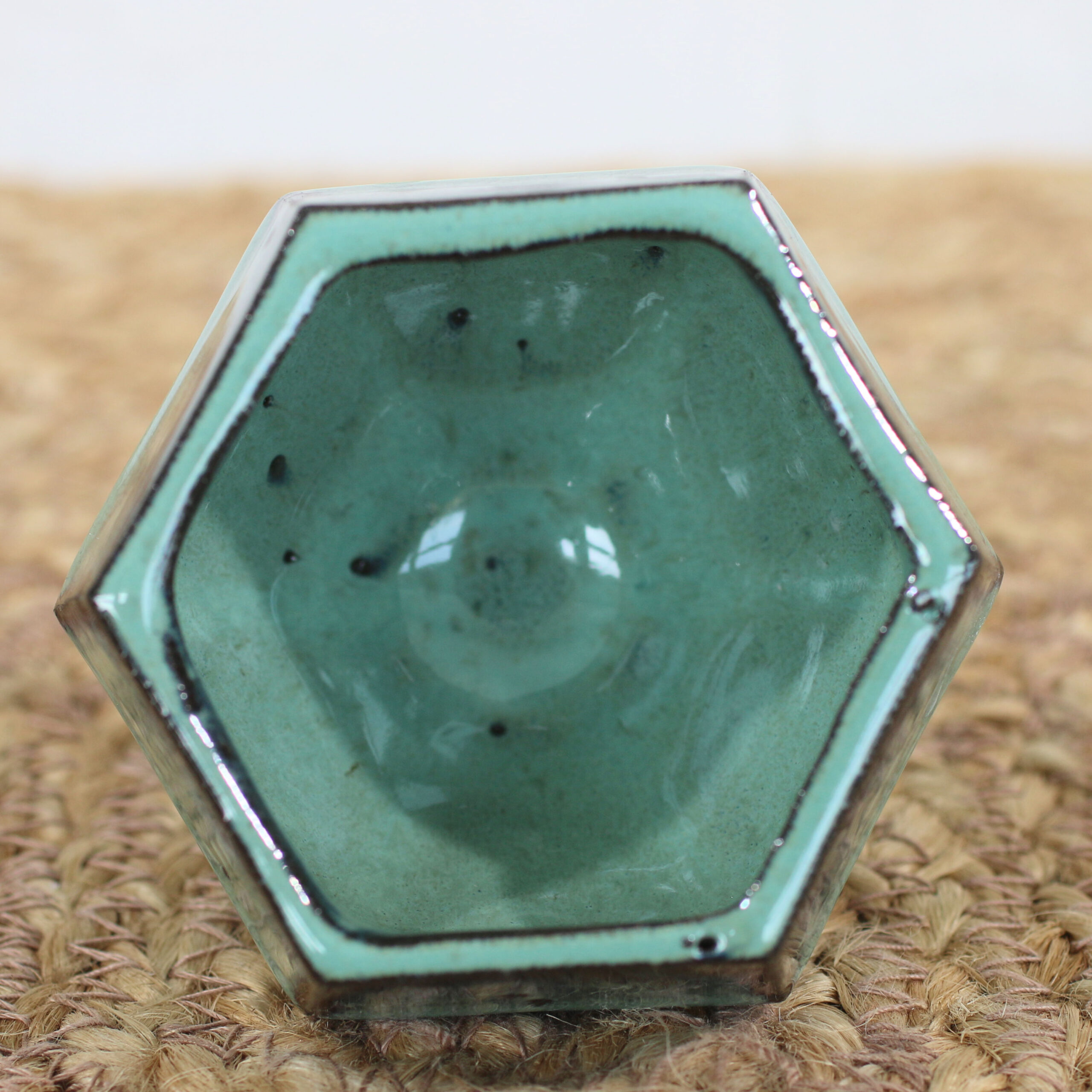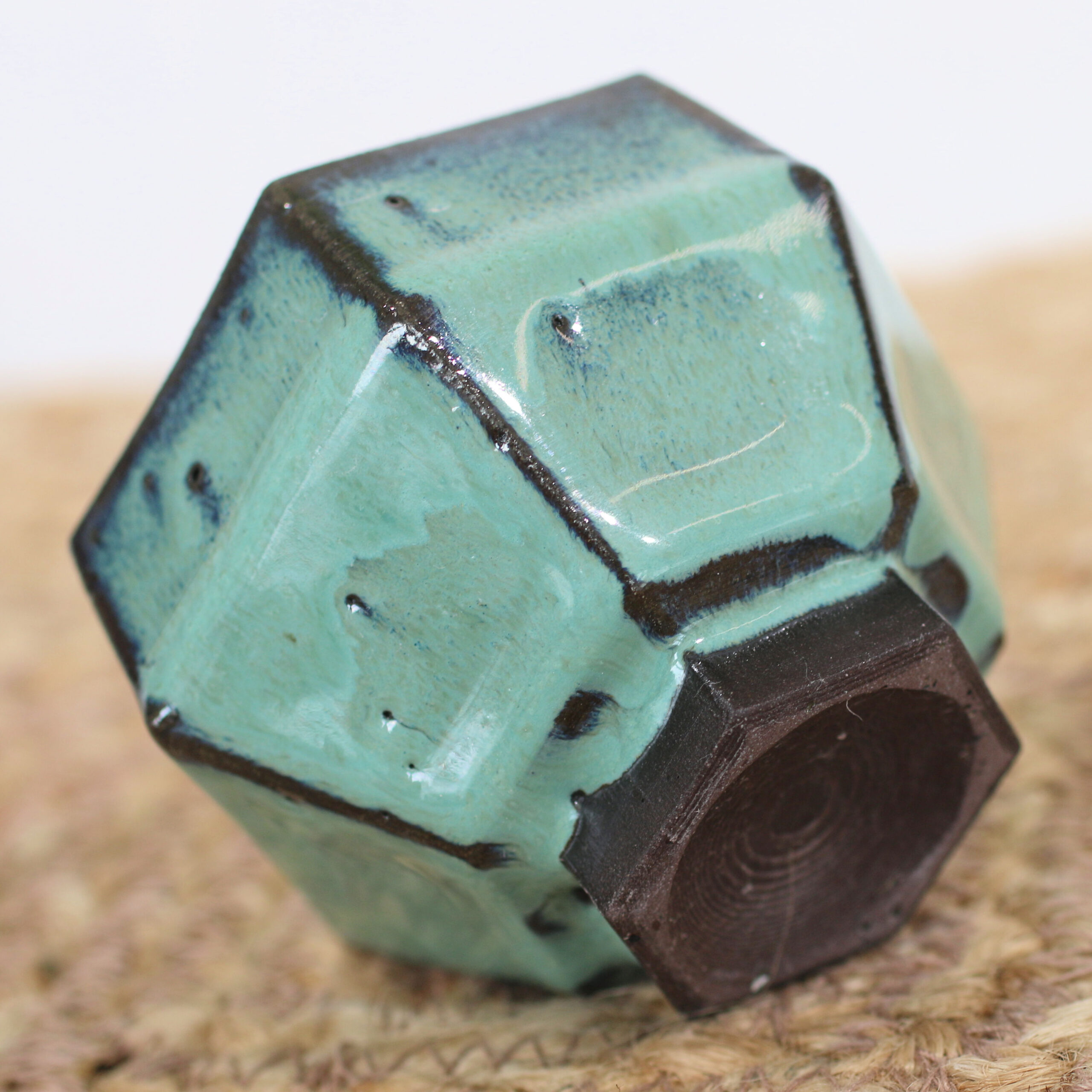 Designed for the mindful tea drinker, this petite 6-sided cup is made for quiet moments of degustation rather than rushing out the door. The geometric, faceted sides fit naturally and perfectly into your hand, while the elegant foot elevates the entire tasting experience. True to our “deliciously wonky” style, the geometric form remains wonderfully organic and imperfect. Glazed in bright turquoise over a rich coffee clay, the finish breaks beautifully across the six angles, pooling into deep navy blues and warm chocolate browns.