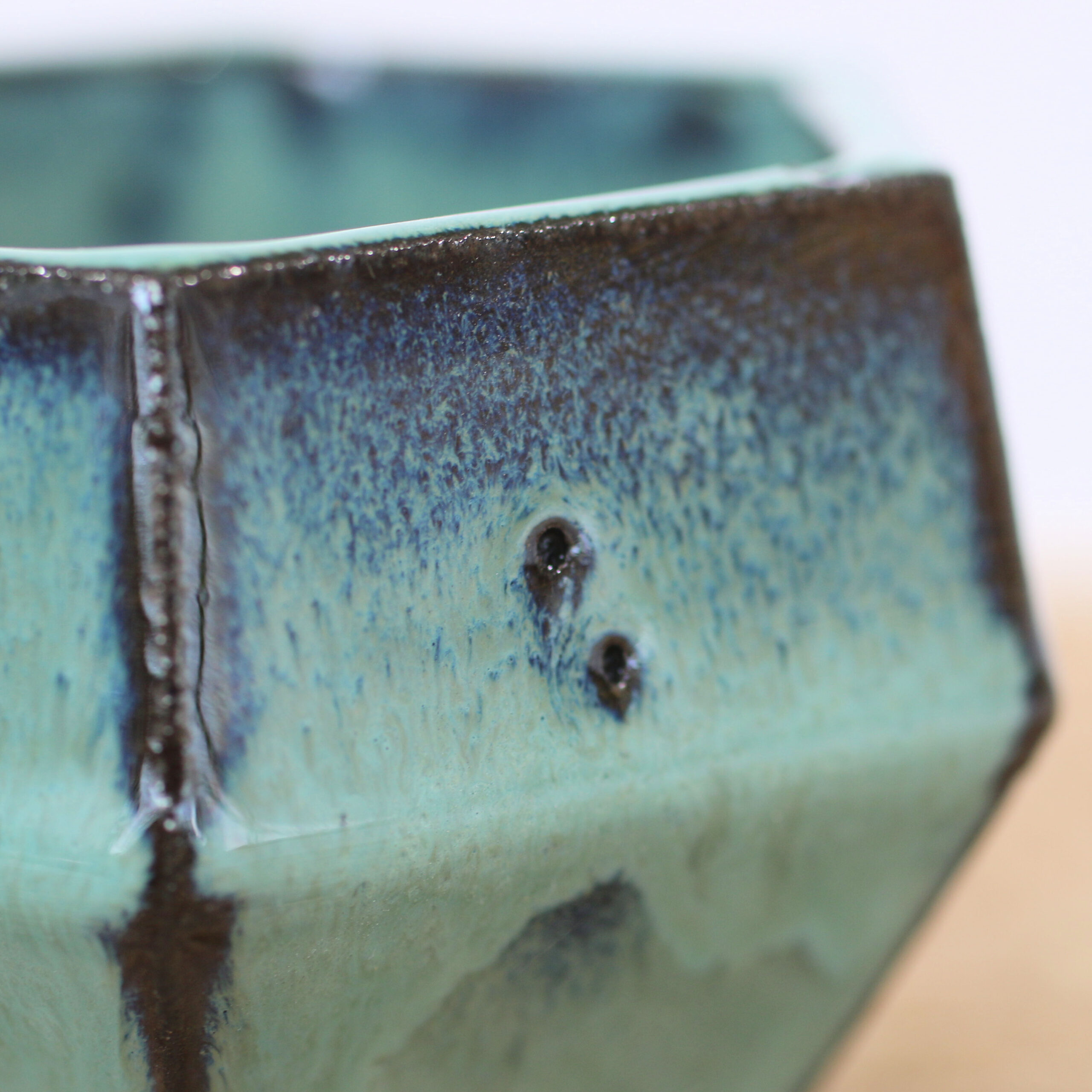 The Glaze: Turquoise over coffee clay, creating dramatic, moody breaks along the edges.