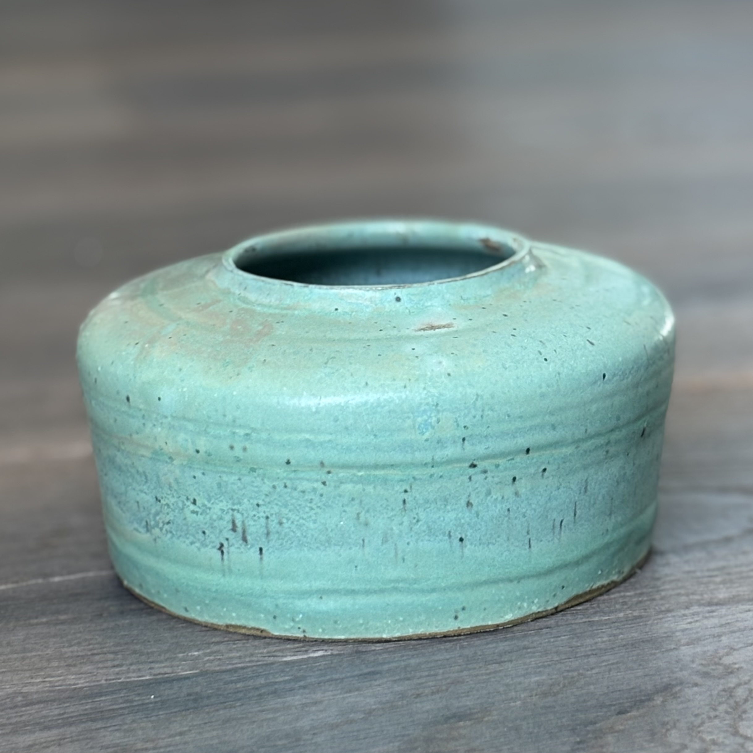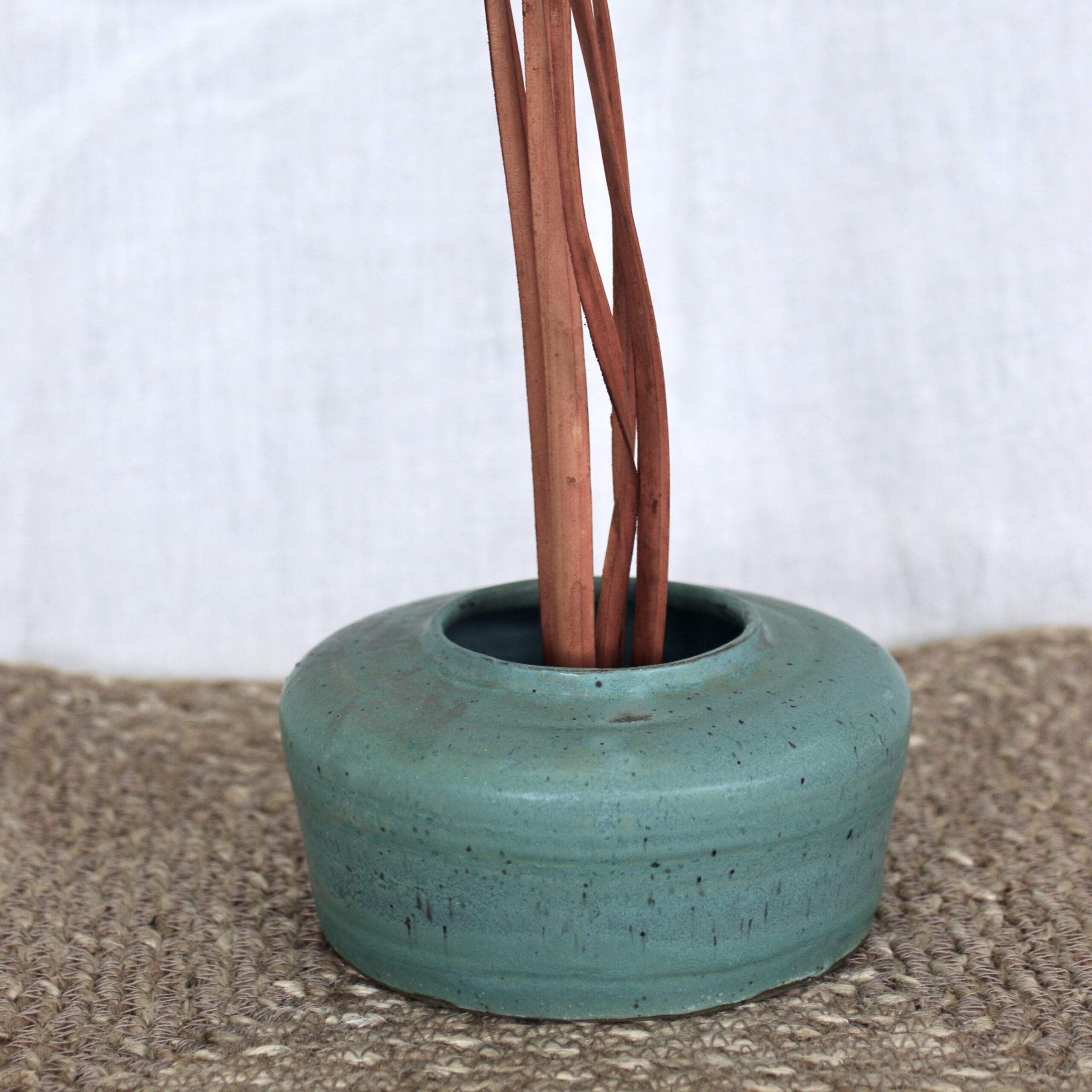Add a brilliant splash of joy to your home! This wonderfully wide vase is glazed in a bright, vibrant turquoise that instantly livens up any table or shelf. Because the mouth is beautifully wide, it is specifically designed to be used with a floral frog (a spiked base that sits inside the bowl) to hold your stems perfectly in place. It looks absolutely stunning holding architectural fresh blooms or acting as a vibrant base for earthy, reddish-brown dried grasses.