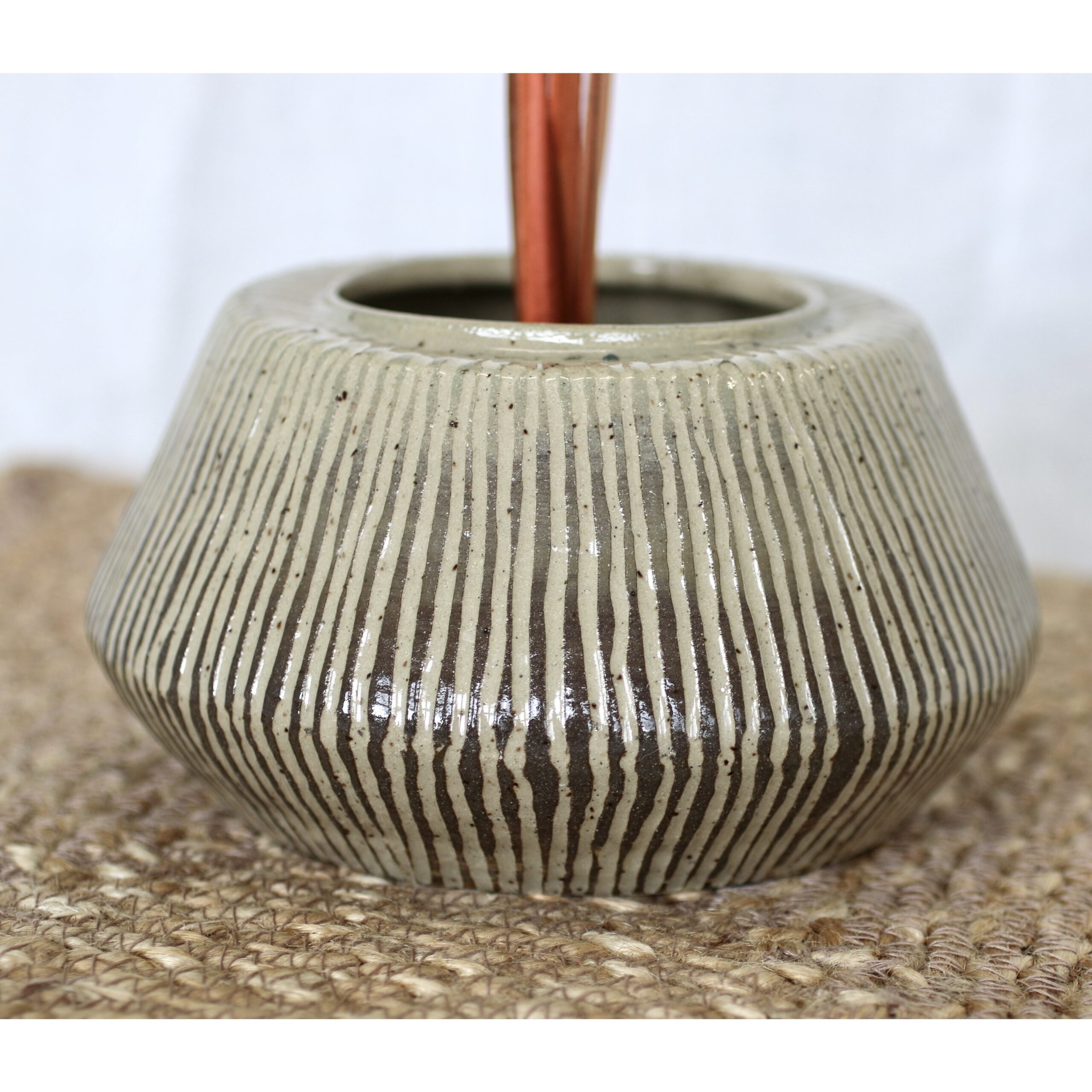 Deliciously wonky and deeply tactile, this wide vase begs to be touched. If you love pottery that feels like it came straight from the earth, this piece is for you. The exterior features a rustic, hand-carved surface where a beautiful brown and green slip has been scraped away to let the natural clay shine through. It is the perfect, shallow vessel for minimalist floral arranging—simply drop a flower frog into the base to secure your fresh blooms or dried grasses into a stunning, natural display.