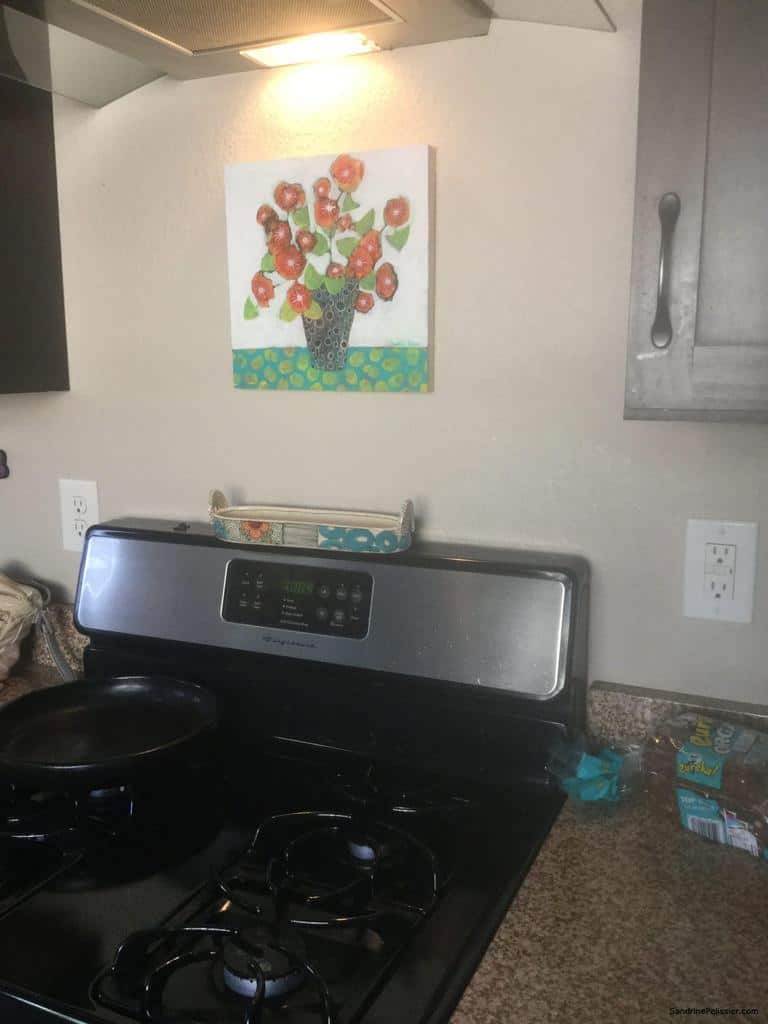 My wife loves color and flowers, and loved Sandrine’s art that we saw in a gallery on a trip to BC. I took a picture of it and surprised her with it for Christmas. She absolutely loved it. Wanted it hung above the stove so she could see it often, since she also loves cooking.